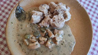 ...más néven savanyú tüdő, vagy savanyú vetrice. Zsemlegombóccal, mint a vadas. Pár hete figyelmes lettem a húspultban a tüdő olcsó árára és vettem egy kilót. 2 és fél óráig főztem és bár vajpuha lett, a hús milyensége nem tetszett nekem, talán három vékony csíkot ettem meg. Viszont a szósz nagyon ízlett és elhatároztam, hogy elkészítem csirkemellből. Ma ez történt, volt hozzá kedvem, mert ez igen melós. Attól savanyú, hogy csemege uborka, citrom leve és héja, mustár, babérlevél és kakukkfű van a mártásban. Ebbe is kell karamell, mint a vadasba és én két evőkanál tejfölt is tettem bele, hogy selymesebb legyen. Finom, érdekes. Semmihez sem hasonlítható ízvilág. Van annyira érdekes, hogy bemutassam. Az elkövetkező két napban nem én főzök. Hurrá!